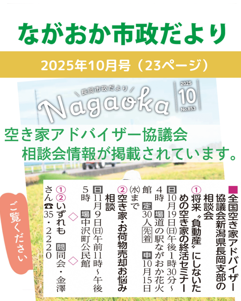 このたび、一般社団法人 全国空き家アドバイザー協議会 新潟県長岡支部主催のイベントが、 長岡市の「市政だより」10月号に掲載されました!